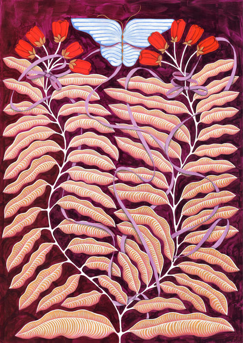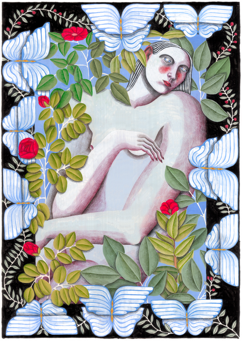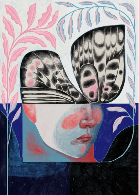 Carla explores abstract fauna and flora, playing with a saturated color palette adding an architectural angle to her floral compositions. Human emotion and flora come together creating an eclectic composition.